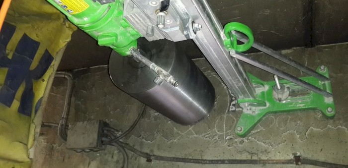 Процесс сверления осуществляется при помощи бурильной установки с водяным охлаждением и коронок определенного диаметра с алмазными сегментами. Оборудование закрепляется на поверхности стены или пола, при этом сверлить отверстия можно глубиной от 450 мм и более, используя удлинители. Бурить можно и под наклоном до 45 градусов, а алмазная коронка способна резать металлическую арматуру (уголок, швеллер), бетон, сильноармированный бетон, кирпич, сибит, пенобетон, асфальт, дерево.